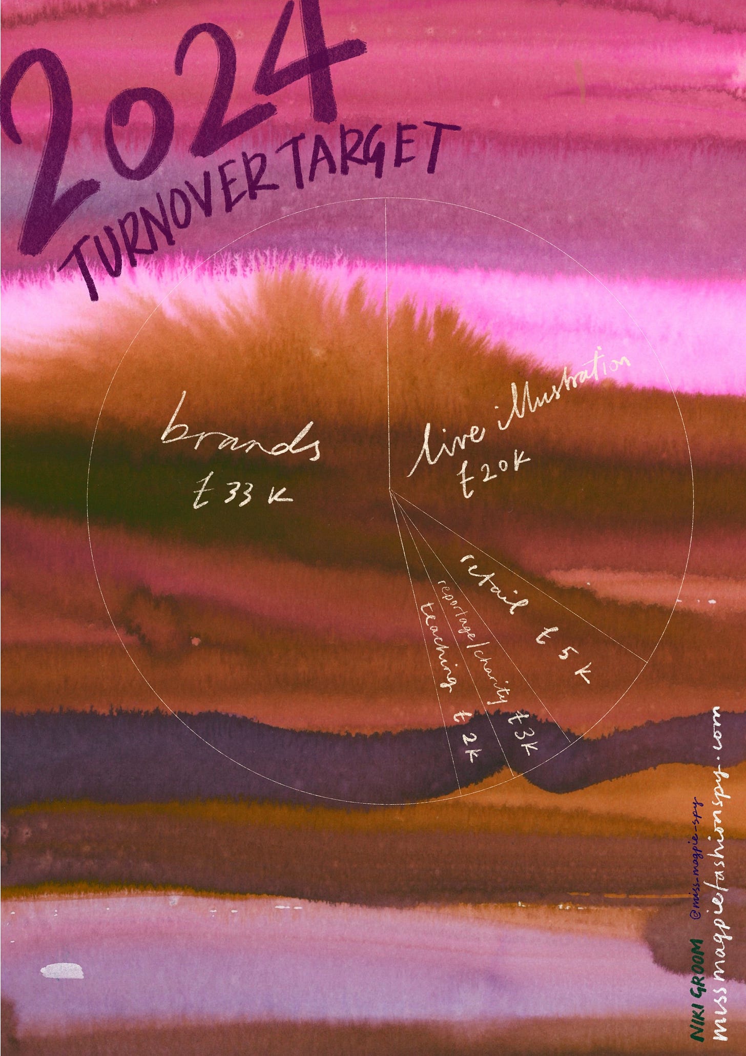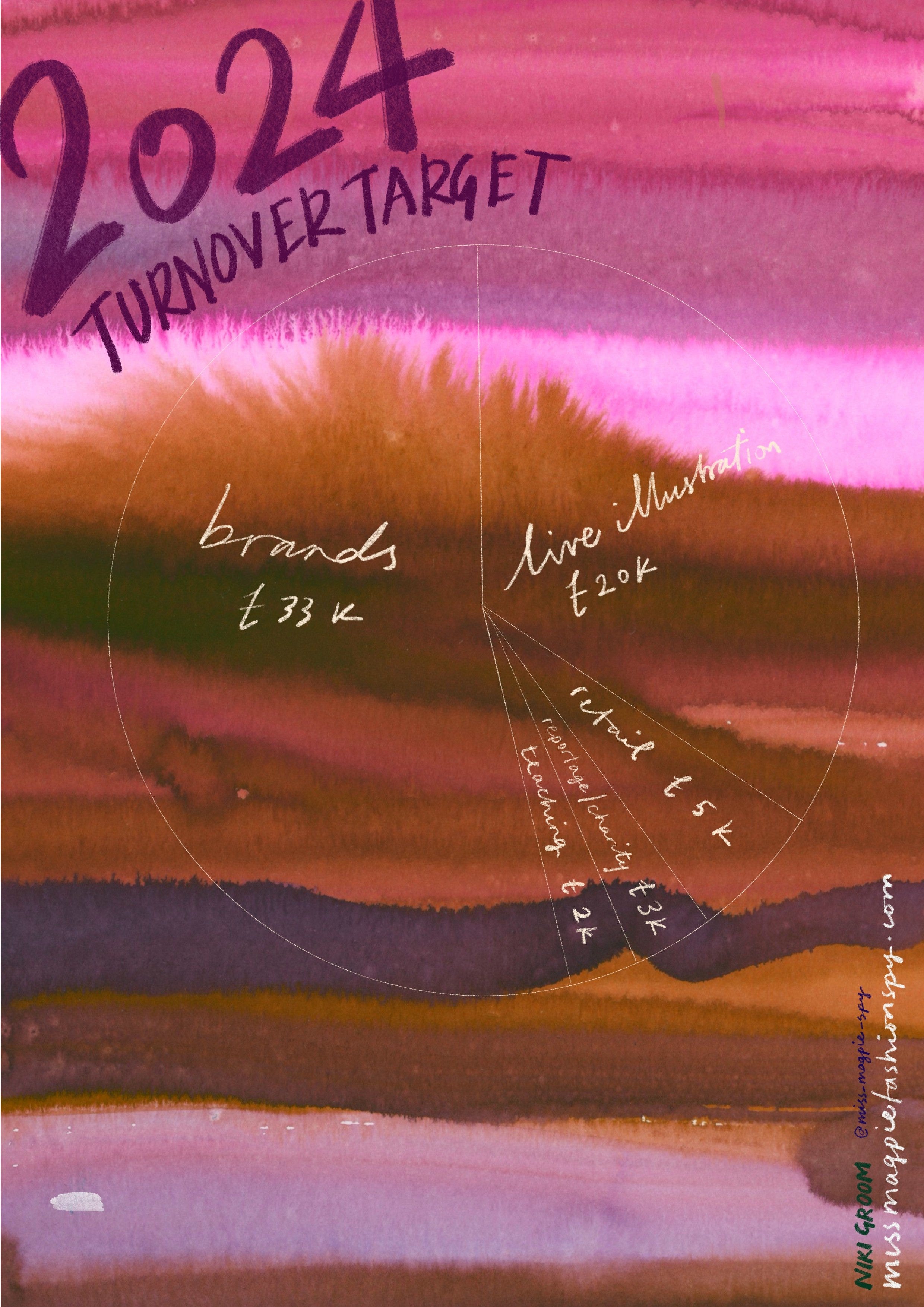In 2024 I’m putting alot of my attention in to brand work and my target is £33k. It means I need a few campaigns, and lots of other work too (editorial, packaging, social media, advertising). It would make it my best year ever for brand work (my best was 2015 when I only did illustration part time, I took £32k that year mainly due to one large worldwide advertising project).