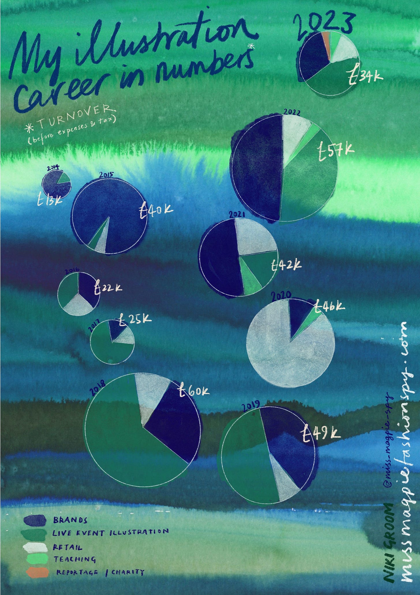I’m going to start by saying that 2023 was good for me. Whilst I took dramatically less money than in 2022 (more on that later), I look back and feel proud about how my art has developed, happy that I was finally commissioned to create reportage artwork and excited to have received some really great feedback from brand commissioners. I also made it back to India to visit friends, and the paintings and maps I created there led to some great commissions. In my personal life I chose to spend a lot of time with a friend who was ill. She died at the end of 2023, and I’m so pleased I was able to make her a priority for those months. I find that being a creative freelancer means my work and personal life don’t cleanly separate, so I find it useful to look at things as a whole.